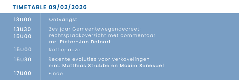 In deze opleiding worden twee thema’s behandeld die in de praktijk van de projectontwikkeling voor veel vragen zorgen, en die vaak voer voor discussie zijn in beroepsprocedures bij de deputatie en bij de Raad voor Vergunningsbetwistingen. De eerste spreker behandelt het Gemeentewegendecreet. Dit decreet trad zes jaar geleden in werking en is van groot belang voor bouw- of verkavelingsprojecten met de aanleg van wegen voor autogebruik, fietsers en/of voetgangers. De zogenaamde ‘zaak van de wegen’ waarvoor de gemeenteraad bevoegd is, werd grondig gewijzigd. In zes jaar tijd heeft het decreet heel wat juridische discussies en rechtspraak opgeleverd. De opleiding geeft een uitvoerig rechtspraakoverzicht waarin de spreker alle juridische en praktische knelpunten bespreekt. Hij probeert inzicht en achtergrondinformatie te geven in de soms uiteenlopende rechtspraak. De spreker heeft hierbij zowel aandacht voor zowel inhoudelijke, procedurele en praktische aandachtspunten, en hij formuleert een aantal kritieken. De spreker geeft ook een doorkijk naar mogelijke decreetwijzigingen in de toekomst, in het licht van het advies van de Gemengde Commissie Vergunningen. In het tweede deel wordt een overzicht gegeven van de recente rechtspraak over verkavelingen. De verkavelingsvergunning bestaat al sinds de Stedenbouwwet van 1962 en de wetteksten hierover beslaan amper enkele regels. Toch – of net daarom – blijft het thema zorgen voor veel onduidelijkheid en discussies. Alleen al de vraag wanneer er een verkavelingsvergunning vereist is en wanneer niet, zorgt in de praktijk voor heel veel vragen, niet in het minst bij projecten met meerdere meergezinswoningen. Intussen wordt op beleidsniveau de vraag gesteld in welke mate een verkavelingsplicht nog noodzakelijk is. Hierover heeft de Vlaamse overheid een studie laten uitvoeren en heeft de Gemengde Commissie Vergunningen een advies verleend. De sprekers geven een doorkijk naar de wijzigingen die er meer dan waarschijnlijk op korte termijn aankomen. Sprekers: De opleiding is praktijkgericht en geïllustreerd met concrete voorbeelden, handvaten en vuistregels voor de praktijk. Ze is gericht op omgevingsambtenaren, advocaten, notarissen, projectontwikkelaars, architecten, landmeters en praktijkjuristen in omgevingsrecht die op de hoogte willen blijven van recente rechtspraak-evoluties en zich willen voorbereiden op de komende veranderingen.